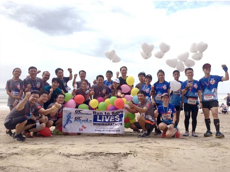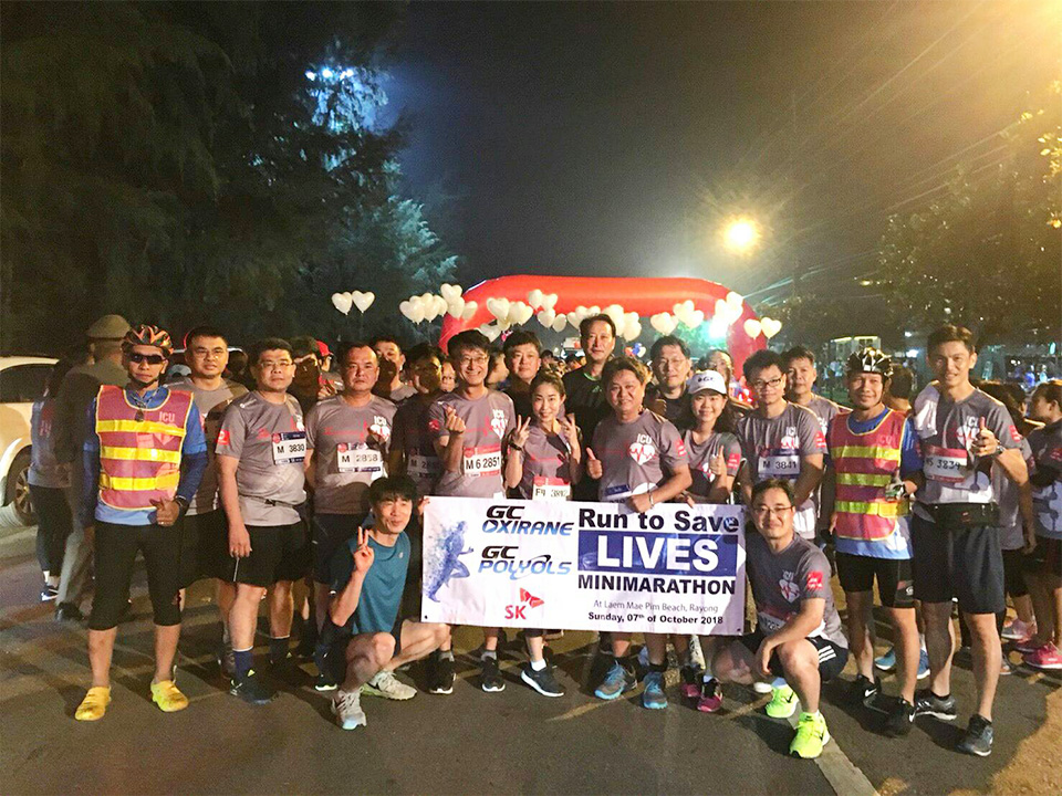 GC Polyols Company Limited (GCP), in collaboration with GC Oxirane Company Limited (GCO), GCP's feedstock provider, and SK Engineering & Construction Company Limited (SK E&C), GCP’s EPC contractor, joined the charity run to save lives minimarathon 2018 at Laem Mae Phim beach, Klaeng district, Rayong. This campaign was held with the aim of raising fund to renovate the Intensive Care Unit (ICU) and purchasing the emergency medical equipment for 3 hospitals in Rayong – Klaeng, Wang Chan and Khao Chamao.